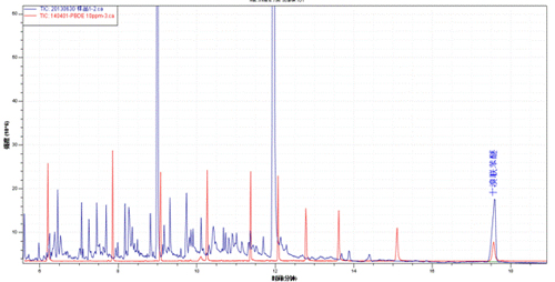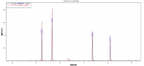 产品的样品加标TIC图(红色)与邻苯混标TIC图(灰白色)