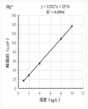 1.0µg/L、2.0.µg/L、4.0µg/L、8.0µg/L、10.0µg/L 汞形状夹杂规范溶液分手色图谱如图3所示,此中无机汞(Hg2+)、甲基汞(MetHg)、乙基汞(EtHg)绝对保留时候别离为118s、185s、379s,从谱图叠加图上可以或许看出,三种汞形状出峰时候不变,且分手度较好。