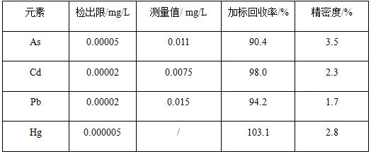 在碰撞反映形式下,之内标法校订仪器旌旗灯号漂移,将配制好的各元素规范溶液上机测试,绘制规范曲线,各元素规范任务曲线线性相干系数R>0.999;对样品空缺溶液平行测定11次,计较11次样品空缺值的规范误差,并以三倍规范误差/任务曲线斜率表现检出限;距离2min,对样品平行测定7次,计较7次测试成果对应的绝对规范误差,表现精密度;对样品停止加标尝试,并计较加标收受接管率。各元素检出限为0.000005~0.00005mg/L,加标收受接管率为90.4%~103.1%,精密度为1.7%~3.5%。