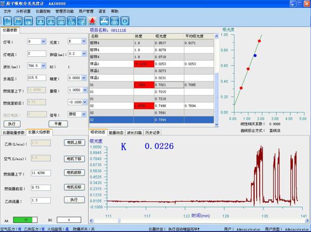 标准化线条方程的制作:切确移取1.00mL,钾标准化液体,放置100mL数量瓶中,开水精提至刻线,混匀。未来发展数量瓶平各移取1.00ml、2.00ml、3.00ml、4.00ml、5.00ml、放置两组100mL数量瓶中,参与2mL硝酸钠,再参与1mL0.1g/mL的氯化铯,用去阴离子水定容,在与测量试色谱仪同基本前提下,测量产品标准化液体的吸光度,减去零氢氧化钠溶液有机废气浓度液体的吸光度,以钾的氢氧化钠溶液有机废气浓度为横作标,吸光度为纵作标制作工作线条方程。