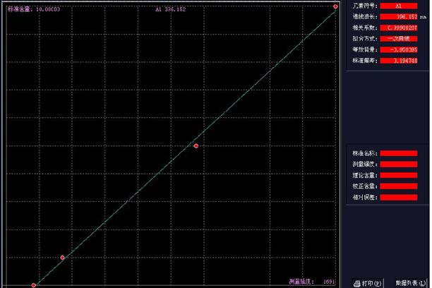 (A道直线方程组:Y=875.144*X-17.003);(A道直线值:0.99916)见图1