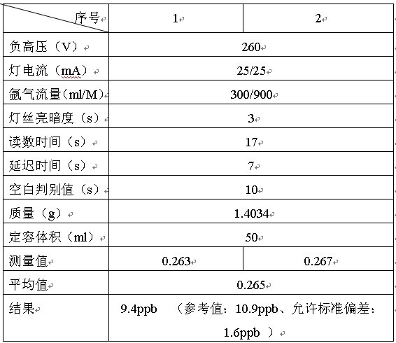 从样件中秤量0.20g摆弄于安全玻璃烧杯里,插足8ml HCl,5mlHF, 8ml HNO3。微波加热消解。急冷后定容于100ml功率瓶中,插足5mlHCl,5%的硫尿和抗坏血酸盐溶液20ml。(一同做样件缺员)。