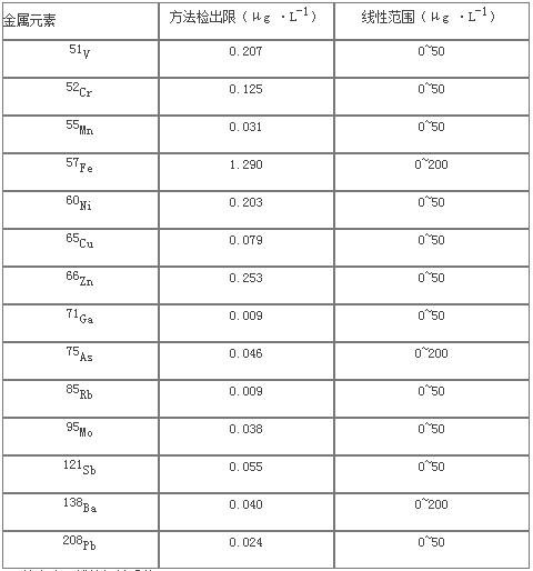 仪器在优化的使命参数前提下,对样品空缺溶液持续丈量11次,以3倍旌旗灯号规范误差所对应的浓度值为检出限(见表1),各元素体例检出限在0.009-1.290μg ·L-1之间。