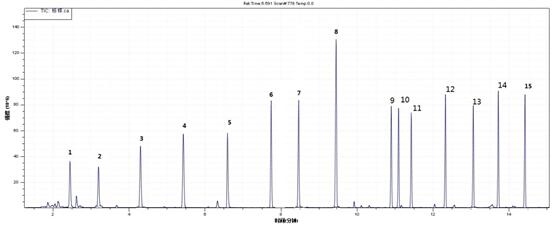 1.正己烷 2.苯 3.三氯乙烯 4.甲苯 5.辛烯 6.乙酸丁酯 7.乙苯 8.对(间)二甲苯 9.邻二甲苯 10.苯乙烯 11.壬烷 12.异辛醇 13.十一烷 14.十四烷 15.十六烷